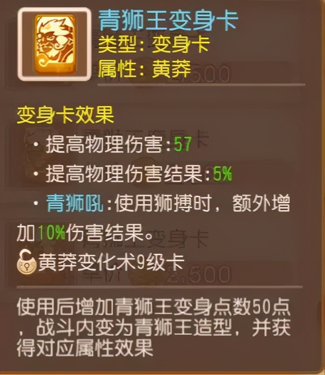 这个狮驼使用的变身卡是青狮王变身卡,作为一个非常少见的变身卡,它在提高物理伤害的同时,还会给予青狮吼的加成效果——使用狮搏时,额外提高10%的伤害结果。
